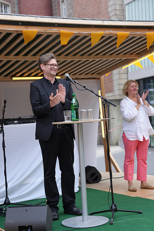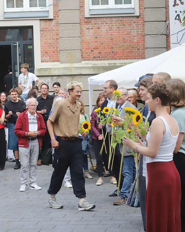 A team of twelve students also planned the courtyard festival – from the musical stage programme to the decorations, kiosk sales and food trucks to the cultural and entertaining supporting programme. Dr Arne Zerbst, President of the Muthesius University of Fine Arts and Design, welcomed Mayor Bettina Aust to the opening ceremony, who referred to the special role of the Kiel art university in her welcoming address. He expressed his special thanks to Vice-President Michael Breda, who has shaped the Muthesius University of Fine Arts and Design since 1999 – long before it became a state art university. On behalf of all those who helped, Zerbst presented sunflowers to caretakers Bernd Fischer and Bodo Ritscher.