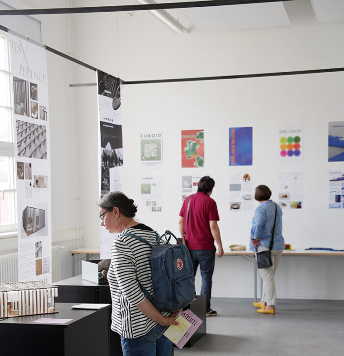 What makes the annual exhibition ‘Einblick/Ausblick’ so special is that it is designed and organised by students. Communication design students Karla Bartsch, Elisabeth Gerberding and Malin Peymann designed the entire look of the annual exhibition, from the logo to the posters. An extensive annual catalogue was also published for the event. Digital insights into the students’ work can be found on the ‘Einblick/Ausblick’ website.